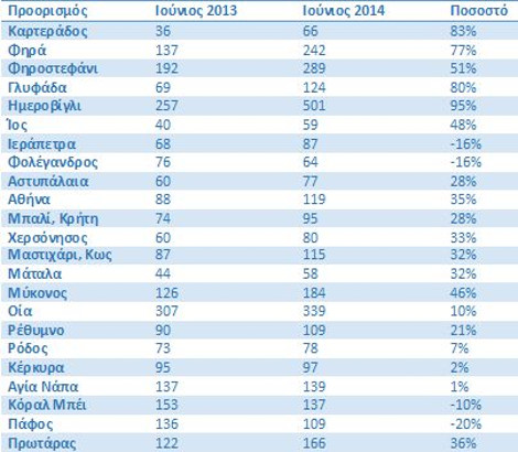 Αντίθετα, η Οία ανεβάζει τη μέση τιμή διανυκτέρευσης μόνο κατά 10%. Φέτος τον Ιούνιο είναι στα 339 ευρώ έναντι 307 ευρώ τον Ιούνιο του 2013.